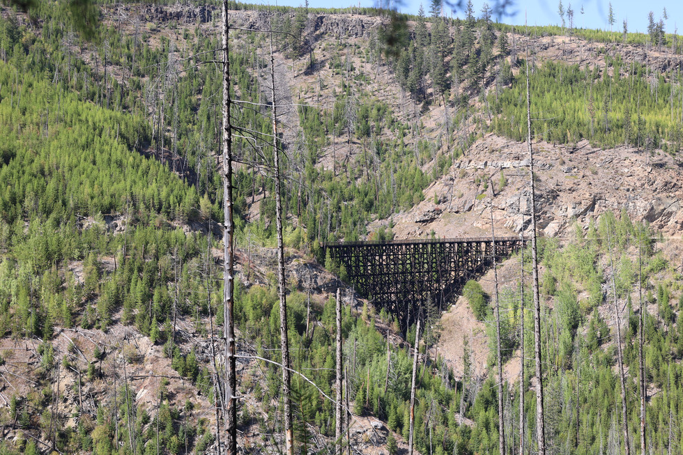 Nach der Kekuli Bay gings ein bisschen weiter gegen Süden. In der Nähe von Kelowna fanden wir einen kleinen schönen Campingplatz auf einer Farm. Von dort konnten wir bergauf per Bike an den Anfang des Myra Canyon fahren. Danach gings von der Ruth Station rund 12km weiter auf dem Kettle Valley Rail Trail über 18 Holzbrücken und durch 2 Tunnels bis Myra Station. Der letzte Teil war dann eine steile Abfahrt über 8 km bis zur Farm.